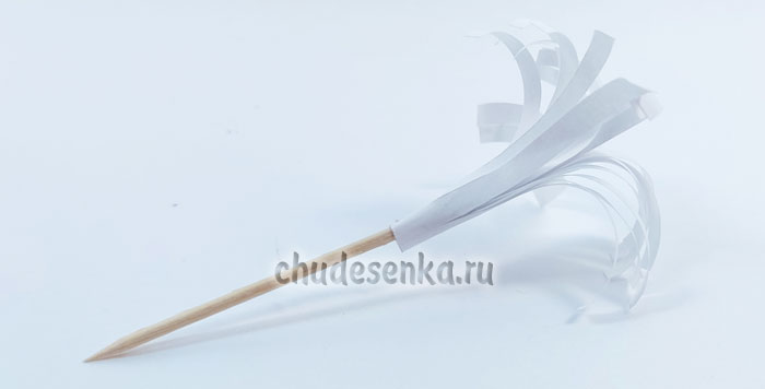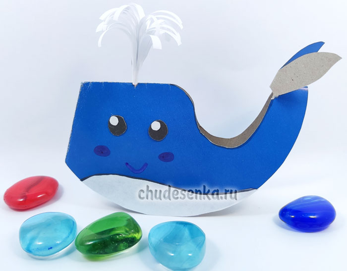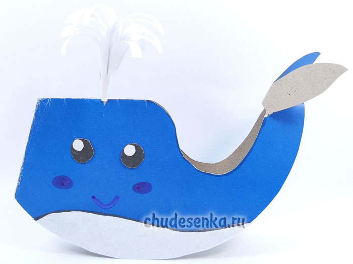 Обычно киты выпускают из отверстия на спине фонтан воды. Этот фонтан изображают на рисунках и поделках, чтобы сделать такую дополнительную деталь. Полосу белой бумаги нарежьте бахромой, завейте ножницами, накрутите с одной стороны на зубочистку в виде фонтанчика.