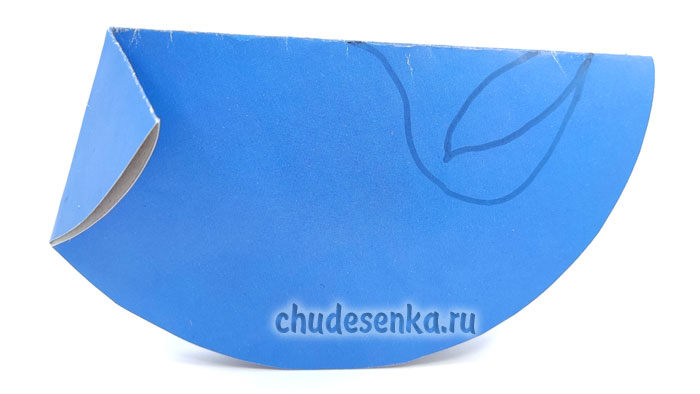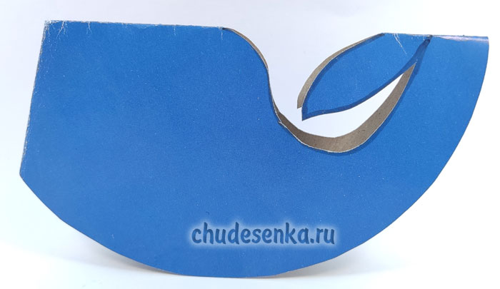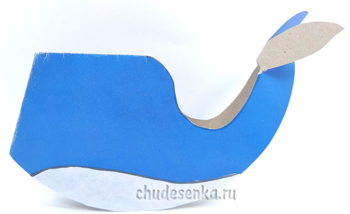 Хвостик отогните, переверните назад. Если вы используете не двусторонний картон, то откроется его серая часть, но это не беда. Данный факт не испортит внешний вид поделки. С двух сторон внизу наклейте белое брюшко или нарисуйте его белой гуашью.