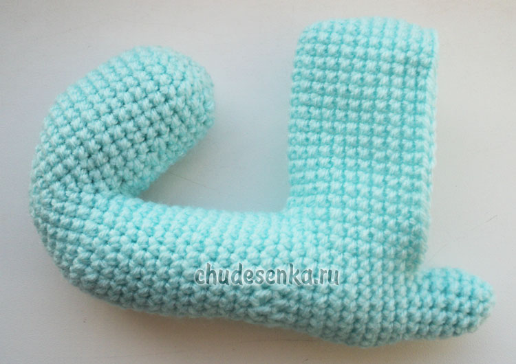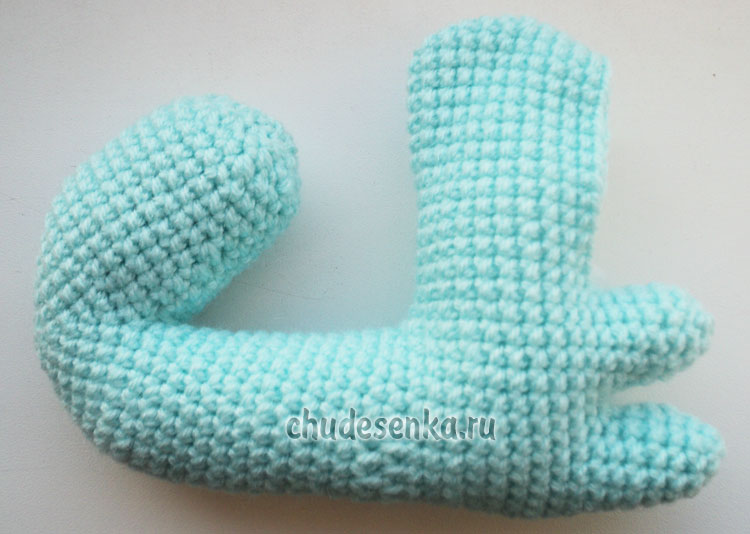 А следующую начинаем вязать с конца. Рядом с нею вяжем последнюю ногу. Оставшееся отверстие на животике зашиваем.