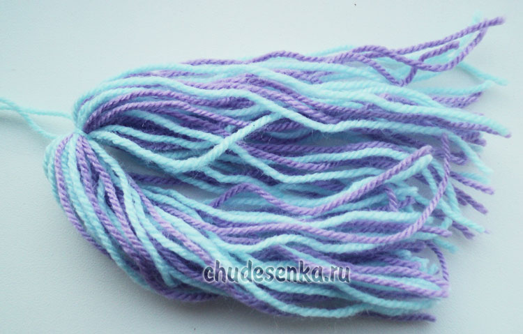 Для гривы и хвоста возьмем два цвета пряжи: голубой и сиреневый. Нарезаем пышный пучок из полосок. Закрепляем ниткой в серединке.