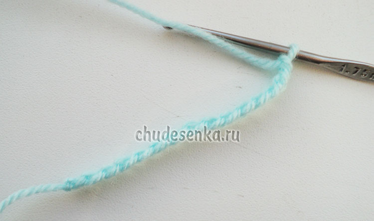 1 ряд – начинаем вязать с цепочки. Вяжем четырнадцать ст.б.н. и три ст.б.н. в последнюю петелечку цепочки.