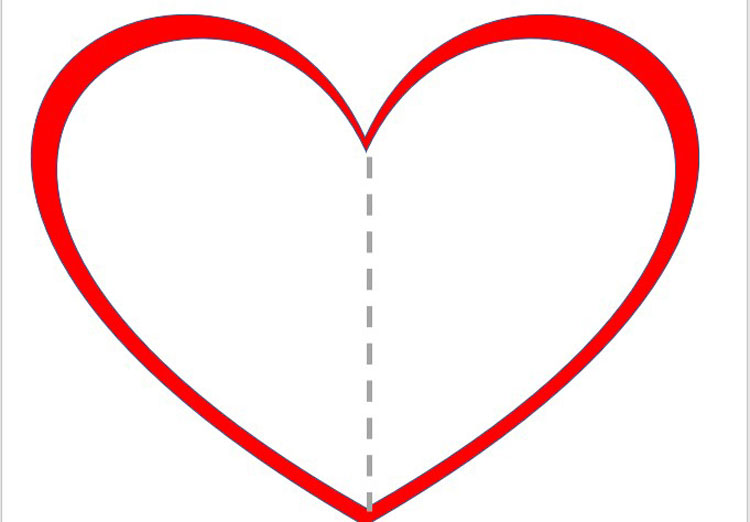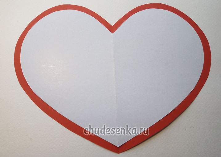 Из белого картона вырезаем заготовку открытки в форме сердца (можно вырезать круг или оставить стандартную форму прямоугольника – лист картона сложить пополам). Из листа бумаги красного цвета вырезаем сердце большего размера с «припускам» в 0,5 сантиметра с каждой стороны. Склеиваем их между собой. Шаблон 1