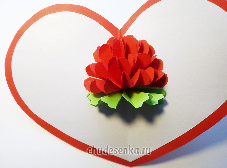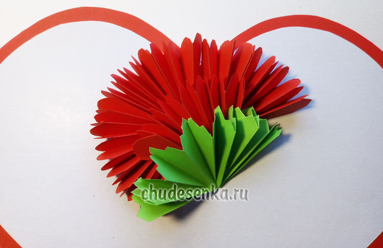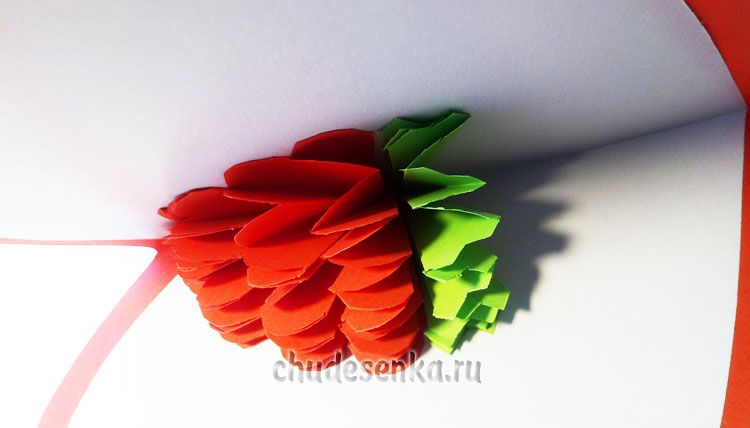 Намазываем клеем второй край каждого лепестка – гармошки и складываем открытку пополам. Плотно прижимаем и держим несколько секунд.