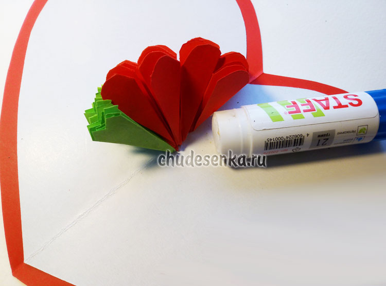 Намазываем одну сторону «гармошки» у каждого лепестка и приклеиваем на открытку как показано на рисунке (веером от центра).