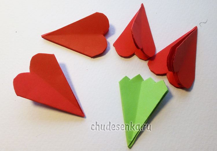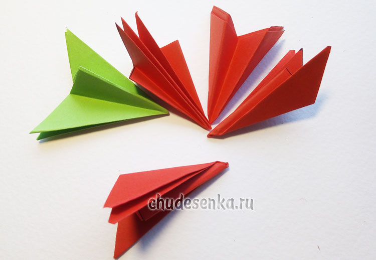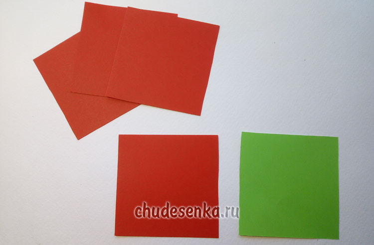 Вырезаем один квадрат из зеленой бумаги и четыре квадрата из красной бумаги размером 10х10 см.
