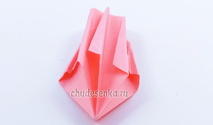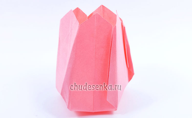17. В раскрытую часть вставьте пальцы и аккуратно разведите бумагу, разгладьте, выдавите наружу все заломы так, чтобы получить модель тюльпанчика.