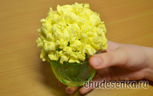 2. Пока гнездо высыхает – сделаем цыпленка. От салфеток желтого цвета отрываем маленькие кусочки и пальчиками скатываем их в небольшие шарики.