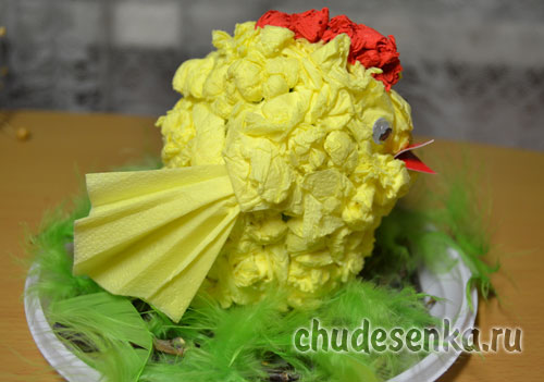 Сверху яйца, на головке цыпленка, делаем хохолок: скатываем несколько шариков из салфетки или гофрированной бумаги красного цвета.