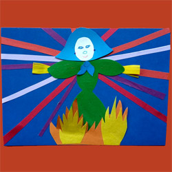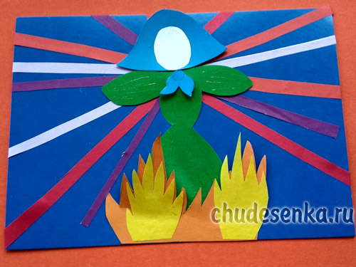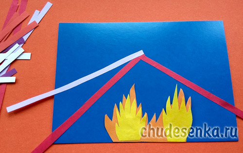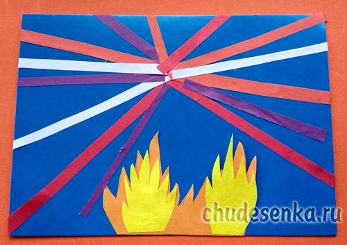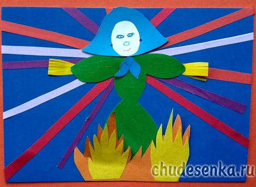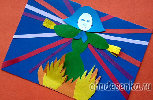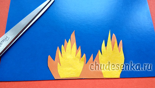 Сделайте заготовку пламени. Подготовьте несколько ярких кусочков бумаги, например, оранжевого и желтого цветов. Нарисуйте с обратной стороны очертания пышного пламени. Вырежьте по контуру. Наклейте в нижней части рисунка, накладывая друг на друга. В дальнейшем на этом костре будет сожжено чучело. Не обязательно делать заготовку пламени ровной, как получится по нарисованной линии, так и оставляйте, чтобы получить правдоподобный результат.