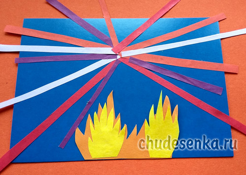 Отрежьте от дополнительных полос бумаги яркого цвета тонкие ленты. Начинайте клеить их по центру. Выберите центральную точку. Смажьте ее клеем. Крепите в эту точку края лент, отводите в стороны, будто лучики.