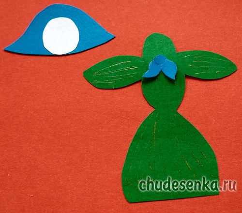 Из дополнительных кусочков цветной бумаги вырежьте заготовки для чучела. Сделайте яркое платье, яркий платок, в центр платка приклейте белый овал, чтобы в дальнейшем нарисовать лицо. Можно добавить блеска с помощью ручек.